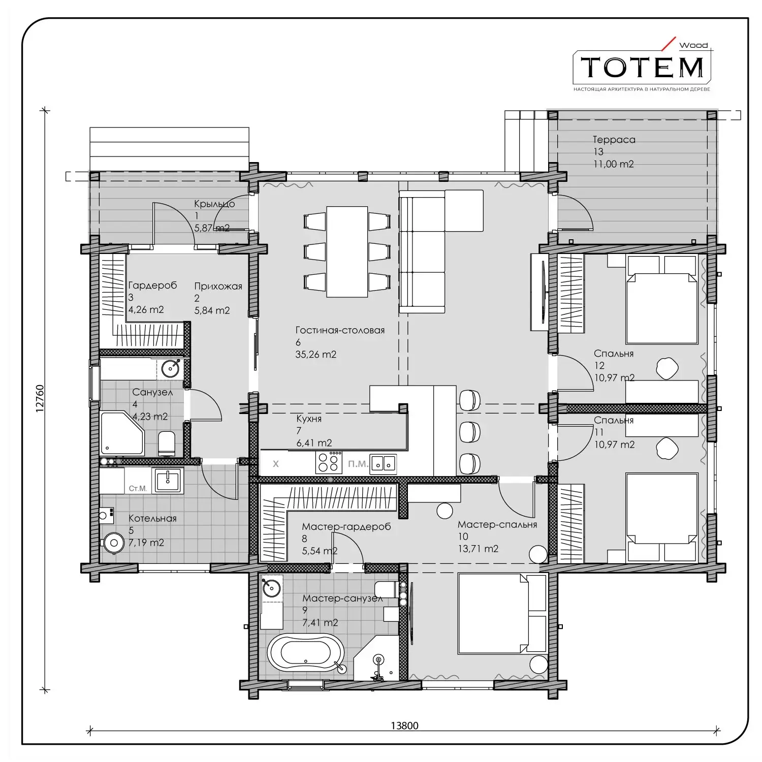 При этом приватные комнаты остаются камерными и тёплыми, а продуманная планировка с двумя гардеробами и котельной скрывает быт за сценой вашей идеальной жизни.