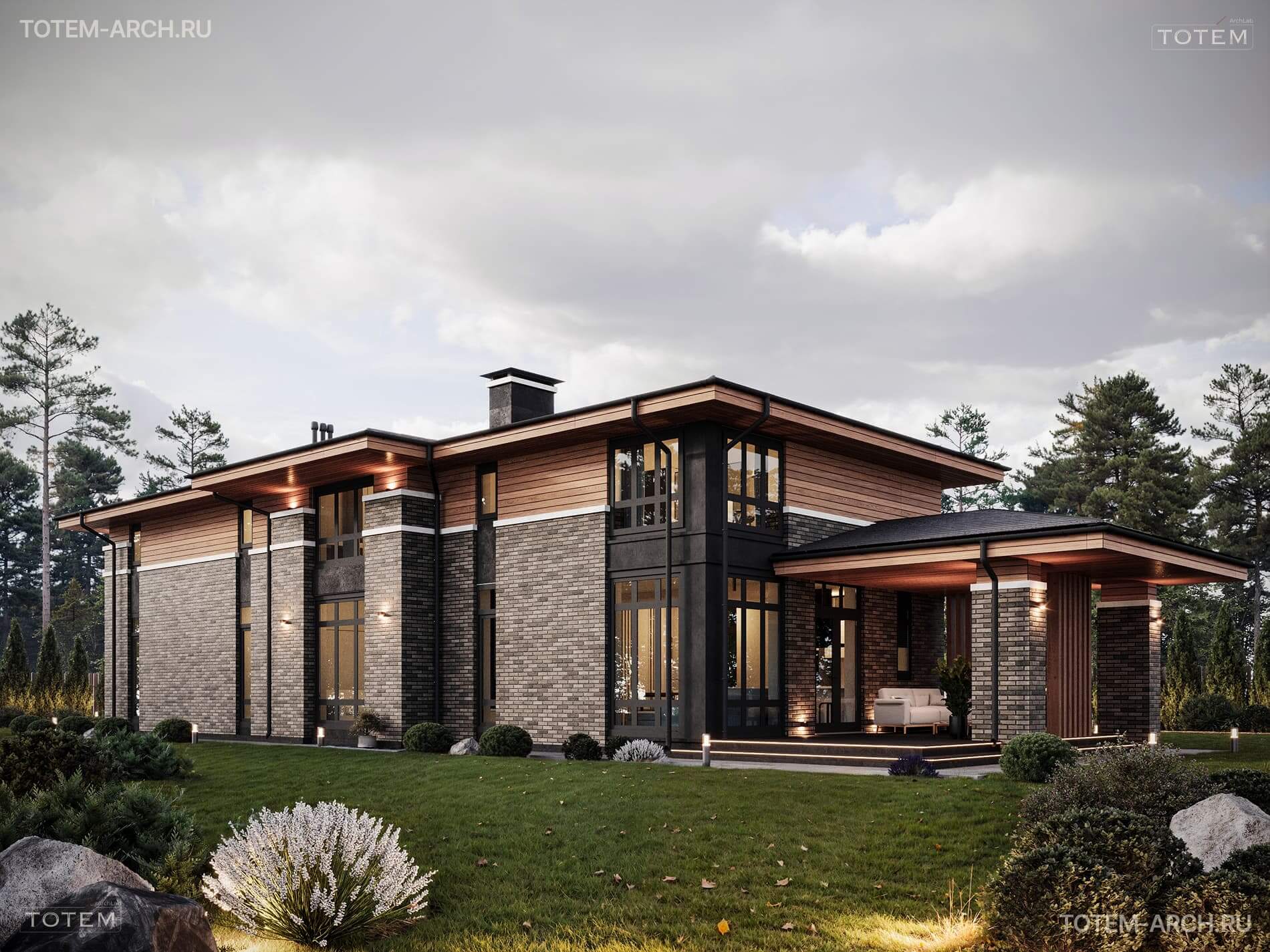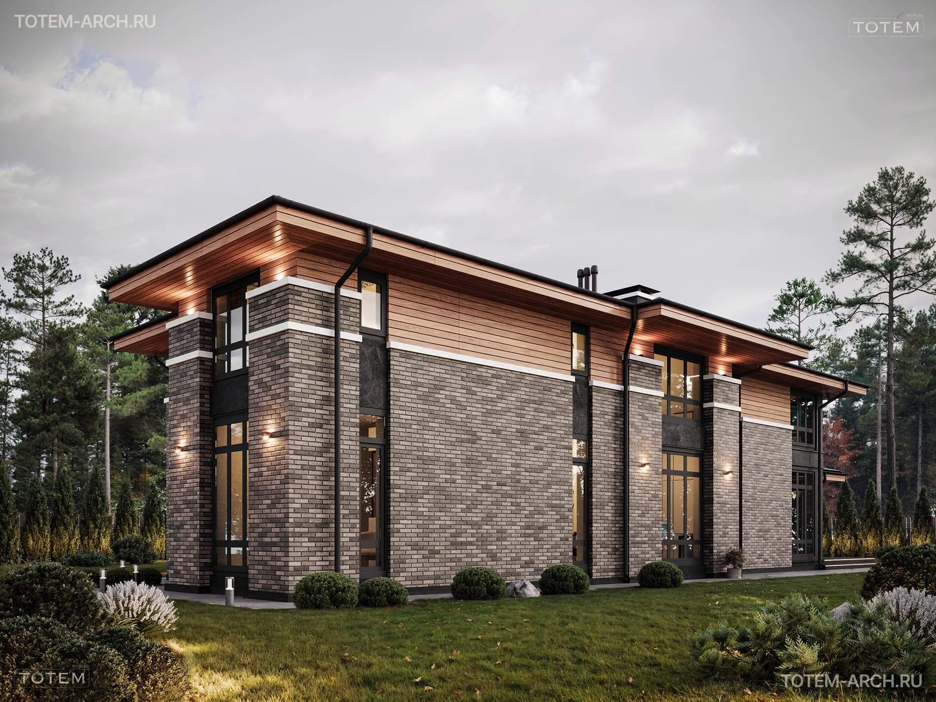Комплексная многослойная отделка фасада с использованием облицовочного кирпича и дерева